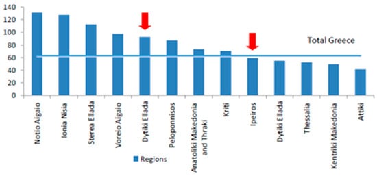 Location and size of the Regions of Dytiki Ellada and Ipeiros [own elaboration [27]].