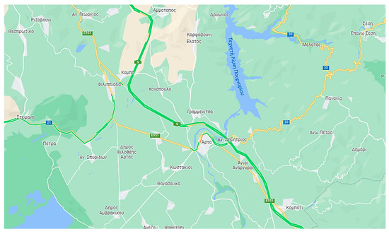 The Perimetric Road of Patras is an expressway that crosses the perimeter of Patras and connects the New National Highway of Patras–Athens (Olympia Odos) with the National Highway of Patras–Pyrgos (Figure 4). The benefits of the operation of this perimetric road for the quality of life of the residents of Patras are reduced traffic, noise and pollutants because cars from the Corinthos–Patras National Highway in the direction of Pyrgos are no longer passing through the central streets of the city.