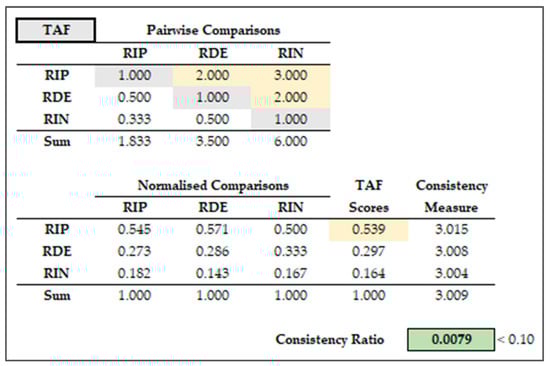 A critical issue in AHP application is that there should exist consistency in the ratings given in the pairwise comparison matrix [46]. Thus, before using the scores derived from the normalized comparison matrix, these ratings must be checked for consistency. A consistency measure for each candidate is a fraction obtained as follows: the numerator multiplies the scores from the normalized matrix by the ratings given in one of the rows of the original pairwise comparison matrix; the products are summed and then divided by the score for the candidate in question. For the TAF criterion and the RIP candidate, this consistency measure is calculated thus: (0.539 × 1 + 0.297 × 2 + 0.164 × 3)/0.539 = 3.015 (see Figure 13). Provided that the amount of inconsistency is not excessive, the scores obtained from the normalized matrix will be reasonably accurate. To determine whether the inconsistency is excessive, the following measures should be calculated, where λ = the average consistency measure for all alternatives and n = the number of alternatives: