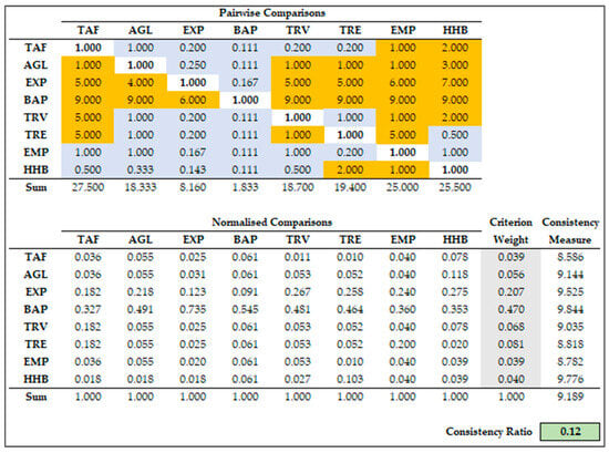 The random index (RI) in Equation (2) is the average value of the consistency index (CI) if all the entries in the pairwise comparison matrix are chosen at random, and it takes values according to [47]. If the CR is equal to or less than 0.10, the degree of consistency in the pairwise comparison matrix is satisfactory. However, if the CR is much greater than 0.10, serious inconsistencies might exist and AHP might not yield meaningful results. The value of approximately 0.008 < 0.10 for CR in Figure 13 (with RI = 0.58 for n = 3) indicates that the pairwise comparison matrix for TAF criterion is reasonably consistent and accurate. However, similar calculations for the other criteria resulted in two unsatisfactory CR values and, as a result, the impacts regarding VMU (0.199) and VAS (0.302) were excluded from the subsequent analysis. GDP and POP criteria were also excluded because they are assigned the same value of 1 (equal importance) in all cases. The same applies to impact IMP but for a value of 2 (equal to moderate importance).