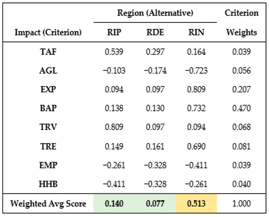The analytic hierarchy process (AHP) provides a structured approach for determining the scores and weights for a multicriteria evaluation model [43,44] and has previously been used for socio-economic evaluation of transport infrastructure, e.g., [45]. Assuming that the three regions of the RIP, the RDE and the RNI are the candidates to be assessed and that the thirteen impacts in Table 17 (abbreviated as TAF, AGL, GDP, EXP, IMP, BAP, TRV, TRE, VMU, VAS, POP, EMP and HHB) represent the evaluation criteria, the following Table 18 can be used to create a pairwise comparison matrix for each candidate regarding each criterion.