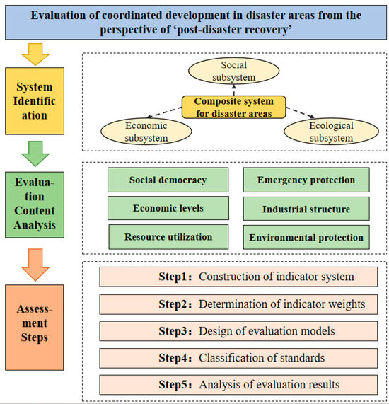 The coordinated development of a disaster area is a conceptual framework that encompasses multiple elements. The relationships among these elements within the complex system of the disaster area are intricate. The subsystems of this complex system exhibit characteristics of continuity and complex interdependence. Consequently, the coordination and development of each subsystem contribute to the overall improvement of the entire system [37,40,41]. The social subsystem includes aspects such as residents’ lives, urban and rural development, infrastructure, and public services. The degree of development within this subsystem largely reflects how well the people-centered approach to post-disaster recovery and reconstruction is being implemented [38]. The economic subsystem includes elements such as the economic level and industrial structure. The level of development within this subsystem reflects the sustainability of progress in disaster-affected areas. Additionally, improving the economic level serves as a significant driving force for the overall development of these areas. The ecological subsystem includes elements like resource utilization and environmental protection. The level of development within the ecological subsystem indicates the environmental foundation available for the development of disaster-affected areas. A healthy ecological environment supplies the necessary resources for the growth and recovery of these areas (Figure 2). Based on the above analyses, the weights of the indicators were determined separately, and, then, the degree of development of each system, the degree of coordination, and the Coordinated Development Index were studied separately, to have a comprehensive understanding of the level of coordinated development of the disaster area.