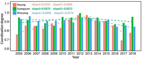 Coordination degree of Mianyang, Deyang, and Guangyuan cities.
