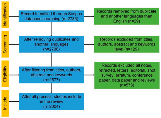 Based on these criteria, Scopus metadata returned a total of 2735 papers on desertification-related research. As a first step, all duplicate documents and non-English publications were removed, leaving 2706 documents. Handling of duplicates: Duplicate records were identified and removed through a systematic process using reference management software. This step was necessary to avoid biasing the analysis with duplicate citations or publications. Duplicates were cross-checked based on publication title, author names, and Digital Object Identifier (DOI) to ensure that each publication was counted only once in the final dataset. Next, documents lacking title information, author data, abstracts, and keywords were excluded, ensuring that the remaining documents contained complete information. Incomplete records: Incomplete records, such as those missing titles, author information, abstracts, or keywords, were excluded from the analysis. These incomplete records would hinder accurate bibliometric analysis, as they are necessary to accurately map citation networks, author contributions, and keyword trends. By excluding incomplete records, we ensured that the dataset used in this study was robust and reliable for drawing meaningful conclusions. This process resulted in 2577 papers. The final step involved filtering out format-related papers, such as notes, retracted papers, letters, editorials, brief reviews, typos, conference papers, data papers, and review articles. After this filtering process, 2004 papers remained. The filtering process is clearly displayed in Figure 1.