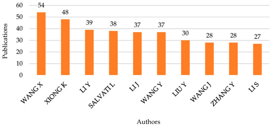 - g-index (capturing cumulative influence): Wang X again dominates with a g-index of 42, followed by other active authors such as Li J, with 37, and Salvati L, with 36.