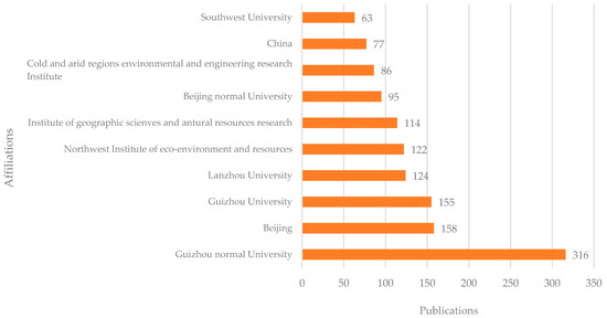 Identifying the most active organizations studying desertification provides insight into the geographic and institutional hubs driving knowledge creation and policy recommendations. The institutional contribution analysis highlights the most significant affiliations based on the volume of articles published on desertification research. Out of 1537 affiliations, we identified 10, as shown in Figure 4. The data reveal the following key institutions: