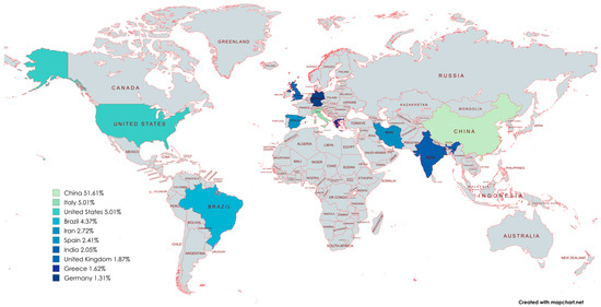 Italy is the second most productive country in terms of desertification output, followed by the United States, with both countries contributing 5% of global publications. However, Figure 6 reveals that the United States ranks second in citation impact, contributing 10%, while Italy ranks fourth, with 4%. This discrepancy highlights the strong research base in these countries and their significant contributions to both single-country publications (SCP) and multi-country publications (MCP) [66,67,68].