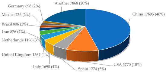 China has emerged as a global leader and research hub for desertification studies. This can be attributed to the country’s unique environmental challenges, including its vast arid and semi-arid regions, as well as government initiatives such as the Great Green Wall and ecological restoration programs [63]. China’s leadership in scientific output is evident, accounting for approximately 52% of global publications, as illustrated in Figure 5. Furthermore, China leads in citations, representing 46% of the total. Figure 6 and Figure 7 demonstrate that while a significant number of Chinese publications are domestically focused, the country also actively collaborates on international projects. Key research topics include sustainable land management, erosion prevention, and large-scale reforestation projects [64,65].