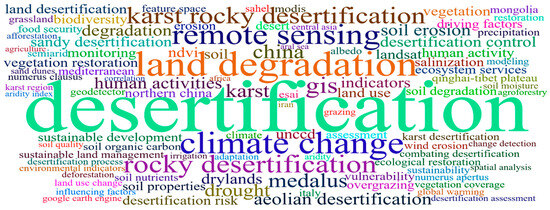 When analyzing the section “Author’s keywords”, the dominant term is “desertification”, which appears 619 times, followed by “land degradation”, which has 142 mentions, as illustrated in Figure 8. Emerging terms, such as “rock desertification” (75 mentions) and “karst rock desertification” (65 mentions), reflect specific regional or geomorphological challenges. Methodological terms like “remote sensing” (95 mentions) and “GIS” (61 mentions) emphasize the growing use of technological approaches. These terms demonstrate how researchers utilize innovative tools like GIS and remote sensing to understand complex phenomena and develop mitigation strategies.