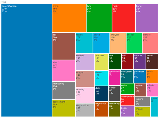 In the “Titles” section, the term “desertification” is the most frequently mentioned word, with 1982 occurrences, underscoring its central importance, as shown in Figure 9. Other frequently mentioned terms include “China” (371 mentions), “soil” (260 mentions), “land” (254 mentions), and “rocky” (251 mentions). These words reflect a strong focus on specific ecosystems and regions. The prominence of terms like “soil” and “land” highlights the ecological and agricultural impacts of desertification as key areas of research.