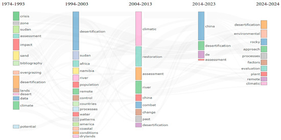 The analysis confirms that “desertification” consistently ranks first across all categories, reaffirming its role as the cornerstone of this field of research. The second most frequently mentioned term is “China”, reflecting the significant research efforts and practical applications in this region. The third category focuses on ecosystems and climate, with terms such as “soil”, “land”, “climate change”, and “vegetation” illustrating the interdisciplinary nature of desertification research, which combines ecology, agriculture, and environmental sciences. This reflects the main focus of research in this area. In addition, new methodological approaches, such as “machine learning” and “GIS”, point to the growing role of advanced technologies in monitoring and mitigating desertification. However, while keyword analysis identifies dominant research topics, it does not reflect how these topics have evolved over time. Analyzing keyword trends across decades would provide a deeper understanding of the changing priorities in desertification research. For example, earlier studies may have focused more on “land use change” and “soil erosion”, while in recent years there has been an increasing emphasis on “artificial intelligence” and “climate change adaptation strategies”. Identifying the rise and decline of specific research areas can show how the research focus has shifted from descriptive case studies to data-driven approaches.