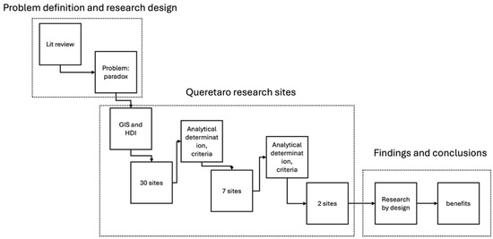 The initial step is to generate a socio-demographic outline of the geostatistical areas of Querétaro, as specified below in 2.2. (Figure 2). This analysis recognized 30 possible neighborhoods with a certain level of vulnerability, including lack of infrastructure and public services, urban connectivity, green space accessibility, and public areas.