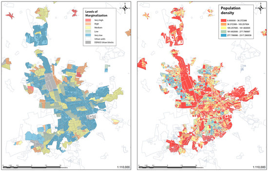 Figure 2 shows the socio-demographic outline of the geostatistical areas of Querétaro. The first map (on the right) shows the margination levels. In red, there are very highly vulnerable areas. In orange, there is a high level; and in yellow, there is a medium level of marginalization. Furthermore, these areas represent the areas that could have the most significant opportunities to impact vulnerable areas. On the other hand, the second map (on the left) shows green and blue as the most dense areas and, therefore, the most significant opportunities due to density conditions. This analysis recognized 30 possible neighborhoods with a certain level of vulnerability, including lack of infrastructure and public services, urban connectivity, green space accessibility, and public areas.