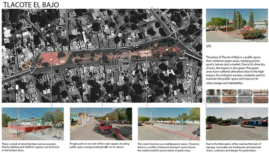 The public plaza in Tlacote El Bajo combines green areas, gathering spaces, sports and leisure facilities, and an itinerary market. According to surveys, the local inhabitants desire to maintain the public plaza and improve their urban image and quality of life (Figure 6).