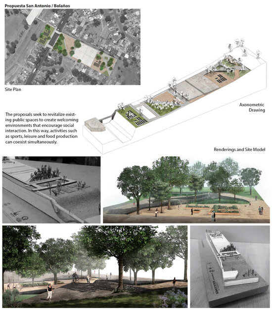 Figure 10 shows the landscape design proposal for a community garden in San Antonio–Bolaños. This proposal transforms a public space, adding complementary sports and leisure programs to the community gardens. The advantage of this site is the existence of social interaction and community interest in revitalizing this area.