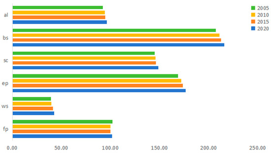 Temporal evolution of the value of different types of ecosystem services (fp = food production services, ep = environmental purification services, ws = water supply services, sc = soil conservation services, bs = biodiversity services, al = esthetic landscape services).