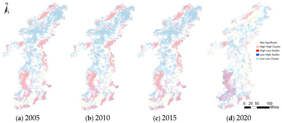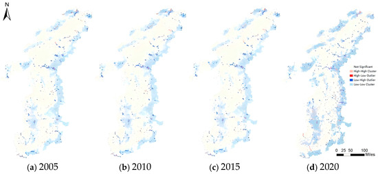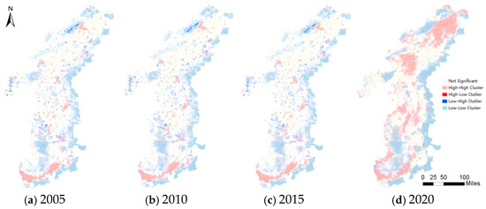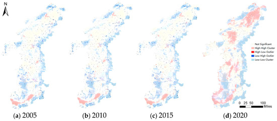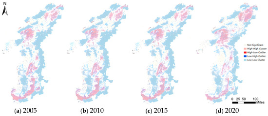 In terms of overall autocorrelation, the Moran’s I index value for environmental purification services was 0.135 in 2005, 2010, and 2015, while it was 0.479 in 2020. This suggests that environmental purification was characterized by a clustered distribution in spatial distribution. Regarding local autocorrelation, the spatial differentiation characteristics of environmental purification in the first three periods primarily showed cluster distribution in insignificant areas, whereas in 2020, it was dominated by cluster distribution in the high–high area (refer to Figure 6). Between 2005 and 2020, the most notable changes occurred in the size of the high–high region, primarily in the north, central, and south regions, with the majority of the changes taking the form of a transition from negligible to high–high aggregation. Specifically, in 2020, compared with the previous three periods, the scope of the high–high region increased, mainly in the north, central, and south regions. Concurrently, the scope of the high–low region increased, primarily in the central region, along with the extent of the low–high region, which increased mainly in the north region. Notably, environmental purification services exhibited a more variable local autocorrelation compared to other ecosystem services.