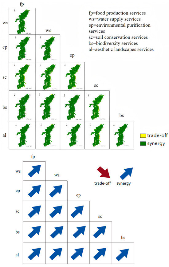 The analysis reveals prevalent synergies among ecosystem services in the region, with a notable trade-off between food production and soil conservation in the central–eastern area, attributed to the lower soil conservation capacity of croplands compared to forests. This spatial pattern is consistent with prior studies in the Taihang Mountains [22,24,29]. Spatial analysis methods effectively illustrate these trade-offs and synergies, offering valuable insights for ecosystem management and policy development.