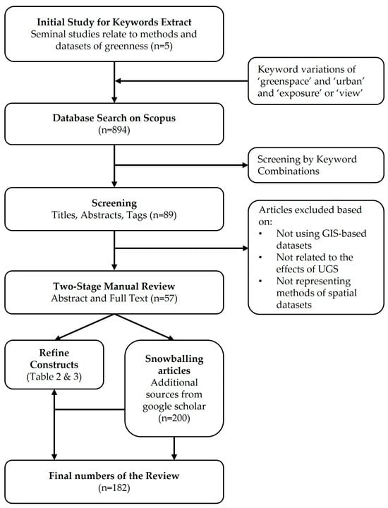 To examine the methods employed in urban areas, initially, we used Google Scholar to search seminal studies (e.g., [8,36,38,56,69]) related to UGS measurements as a literature review. The retrieved literature contains methods for measuring or assessing greenness in certain spatial areas. Through the seminal studies, we extracted search keywords for searching in the Scopus search engine. We iterated through combinations to finalize the list of keyword terms. The following are the search terms: “greenspace” or “green space” or “greenness” or “greenery” or “green infrastructure” and “urban” or “city” or “metropolitan” and “exposure” or “visibility” or “view” or “viewing” or “visual”. We included articles written in English and published in peer-reviewed journals. The keywords search on Scopus retrieved 894 documents. A quick review of these titles (out of 894 documents) resulted in a majority of that seemed to be irrelevant to the purpose of this research. We suspected this was due to the broad range of topics that can be covered under keywords such as “green”, “urban”, and “view”. Additionally, due to the interdisciplinary nature of our research questions and objectives, identifying relevant literature using only specific academic terms may have led to unexpected results. For example, terms such as “green space exposure”, “nature experience”, “perceived natural landscape”, and “green space evaluation” carry distinct definitions but can be applied differently, despite often using similar GIS-based data representing vegetation.