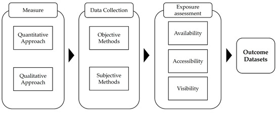 In this section, we explore three different methodological themes identified in the literature. These themes include measurement approaches, methods for data collection, and finally, how researchers are producing exposure assessments. Figure 2 illustrates these three themes (Measure, Data Collection, and Exposure assessment), along with the associated subtopics, which are further explained below.