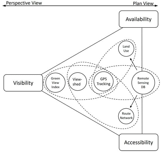 The measurement of exposure to UGS can use a range of different qualitative and quantitative approaches, as well as incorporate both objective and subjective methods [23,36]. These types of assessments serve as a bridge between how something is measured and how it might be used or experienced [26]. A broad range of studies in urban planning and public health disciplines explore these approaches. Their purpose is typically to link UGS to the quality of the living environment and overall public health [8,56]. One of the seminal studies cited in this review by Labib et al. [36] introduced three different types of exposure methods: availability, accessibility, and visibility.