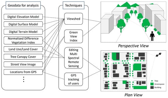 The perspective view approach involves various methods typically derived from variations of a GIS-based viewshed algorithm [38,92,106,136,147], but includes a fundamentally distinct approach called the Green View Index (discussed at the end of this section). Viewshed approaches are usually based on geospatial datasets, such as NDVI, LULC, and Tree Canopy Cover datasets together with topography data (and other visual constraints). These analyses identify the amount of green space that might be visible from a given location or route. The second technique, known as the Green View Index, quantifies visibility by analyzing large collections of geo-tagged photographs. This process identifies the amount of green within a photograph. The various techniques are highlighted in bold italic text in the following paragraphs.