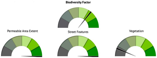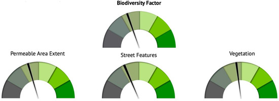 Speedometer charts reflecting the post-development site performance. Dark grey represents the least and dark green the best possible score distribution. The top speedometer chart reflects the overall Biodiversity Factor, while the bottom three speedometer charts (from left to right) reflect the performance of the three categories: “Permeable area extent”, “Street Features” and “Vegetation”.