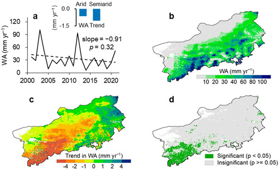 - Han, X.; Chen, Y.; Fang, G.; Li, Z.; Li, Y.; Di, Y. Spatiotemporal Variations and Driving Factors of Water Availability in the Arid and Semiarid Regions of Northern China. Remote Sens. 2024, 16, 4318. [Google Scholar] [CrossRef]