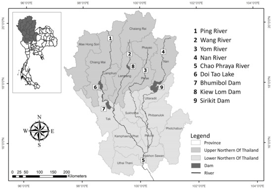Northern Thailand is located between 14°56′23.926″ and 20°28′0.105″ N, and 97°20′32.732″ and 101°25′18.491″ E (Figure 1) and covers approximately 157,924.14 km2 including 11.79 million inhabitants. It is the fourth most densely populated region of the country [38]. The region includes 17 provinces divided into upper and lower parts. The upper part contains several large cities, listed in terms of declining population density as follows: Chang Mai, Cheng Rai, Lampang, Nan, Phayao, Phrae, Lampoon, and Mae Hong Son Province. The cities in the lower part were listed in terms of declining population density as follows: Nakhon Sawan, Phetchabun, Phitsanulok, Kamphaeng Phet, Tak, Sukhothai, Phicit, Uttaradit, and Uthai Thani Province [38]. Northern Thailand has an abundance of natural resources and ecosystems, with the major land uses being urban land, forests, dams, and agriculture. The upper part contains the headwaters of the main rivers, i.e., the Ping, Wang, Yom, and Nan rivers, that flow across the region to an outlet at the Chao Phraya River in Nakhon Sawan. These main rivers are blocked by four larger dams: Doi Tao Lake Dam, Bhumibol Dam, Kiew Lom Dam, and Sirikit Dam (Figure 1).