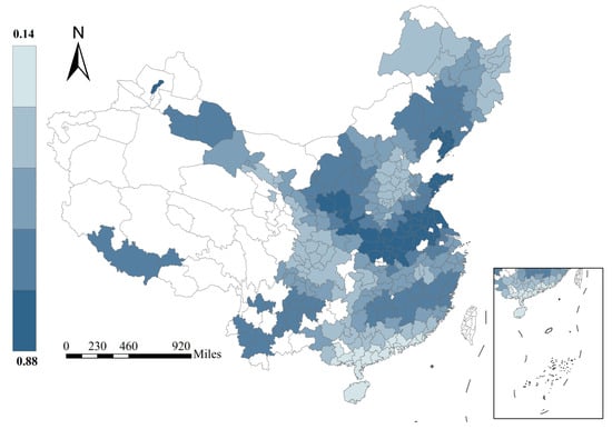 The local R2 distributions of the MGWR model are presented in Figure 3. A key distinction between the MGWR model and the classical OLSs model is that each observation within the MGWR framework is assigned a unique value, with higher R2 indicating a better goodness-of-fit for the regression results in the corresponding city. Overall, the local R2 of the MGWR model ranged from 0.14 to 0.88. Regionally, the MGWR model exhibits higher local R2 in central China, and the local R2 for most cities surpass those of the OLSs model, further highlighting its superior performance in capturing spatial complexity at finer scales.