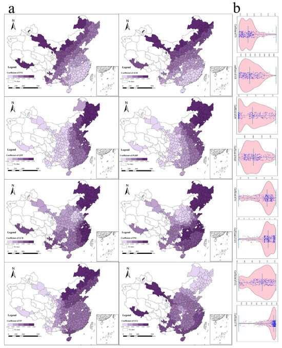Figure 6 illustrates the spatial distribution and violin plots of the regression coefficients for the eight control variables. The spatial distribution (Figure 6a) shows that the influence of industrial structure upgrading PTI and AURs exhibits a declining trend from the northwest and northeast to the southwest. However, the direction of their influence differs, with PTI having a positive impact and AURs having a negative impact on SPRCR. The violin plots (Figure 6b) provide a visual representation of the distribution of regression coefficients for each control variable, highlighting the variability in their influence across different regions.