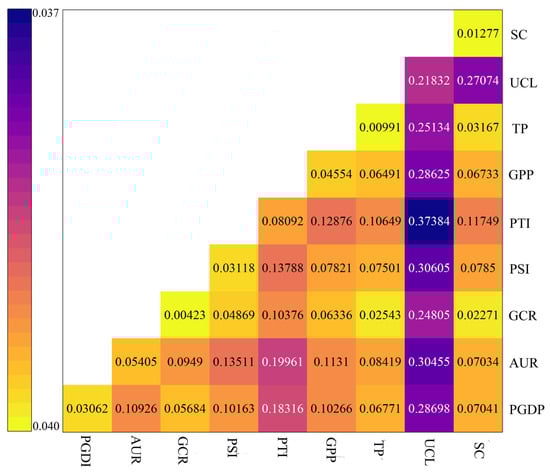 Figure 7 shows that the interplay between urban shrinkage and control variables has a stronger explanatory capacity for SPRCR’s spatial distribution. Notably, nonlinear enhancement prevails, indicating a superior explanatory power over individual factors. Among all variable interactions, the interaction between UCL and PTI yields the highest q-value (0.374), indicating the strongest explanatory power for the changes in SPRCR. Within the interactions involving urban shrinkage and control variables, the interaction between urban shrinkage and UCL achieves the highest q-value of 0.271, demonstrating a substantial explanatory power for the changes in the synergy degree. Although the q-value for the interaction between urban shrinkage and both PGDP and AURs is 0.070, the interaction enhancement effect between urban shrinkage and PGDP is notably higher than that with AURs, owing to the lower single-factor q-value of PGDP compared to AURs. By contrast, the enhancement effect of the interaction between urban shrinkage and UCL is significantly greater than that with other control variables. Considering the interplay between urban shrinkage and land use changes is crucial for environmentally sustainable development.