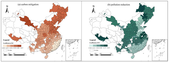 Figure 8. Regression coefficient of shrinking cities (SCs) on (a) pollution reduction and (b) carbon mitigation.