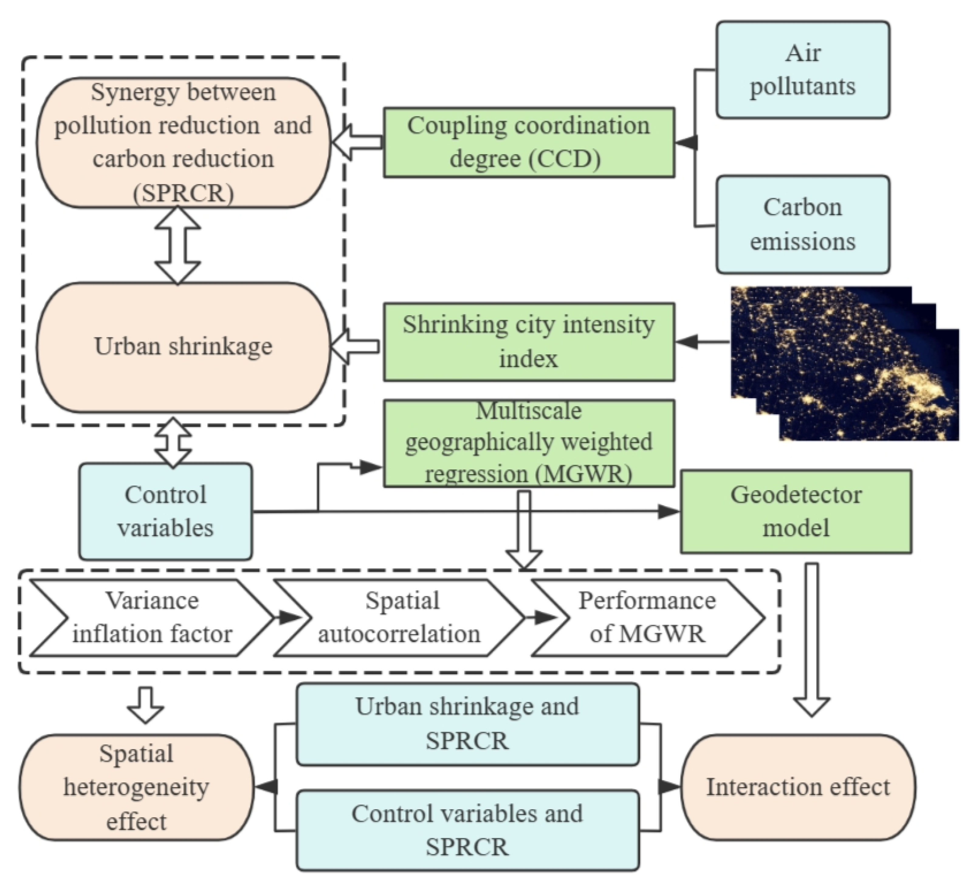 Shrinking cities are often used to refer to those urban areas that are experiencing population decline, economic recession, and job losses [7]. Some scholars contend that although urban shrinkage presents social and economic challenges, population reduction can, to a certain degree, alleviate resource and environmental pressures, freeing urban land for ecosystem services to enhance sustainable urban development [23,24]. Research on shrinking cities’ development pathways is transitioning from emphasizing socio-economic negative impacts towards environmental sustainability. In terms of atmospheric pollution, Qiang et al. [25] found that urban shrinkage reduces air pollution in local and surrounding areas. Conversely, Rao et al. [7] indicated that urban shrinkage leads to air quality deterioration, with more pronounced impacts from urban shrinkage and sprawl-type expansion on air quality. Shrinking cities exhibit a more pronounced increase in carbon emissions compared to their non-shrinking counterparts [8,26]. Most studies indicate that shrinking cities, resulting from population loss, economic recession, decreased urban density, challenges in upgrading industrial structure, and inadequate urban innovation, often yield detrimental effects on carbon reduction by fostering inefficient energy utilization and increased carbon emissions [22,27,28]. However, some scholars argue that decreased population density reduces pressure on natural resources, potentially leading to the restoration and densification of natural vegetation. Additionally, reduced human energy consumption in cities, weaker industrial production intensity, lower road traffic volumes, and decreased residential energy consumption are conducive to achieving carbon neutrality [24,29,30,31]. Despite these insights, the existing literature largely treats pollution reduction and carbon mitigation as separate issues, with limited exploration of their synergistic relationship in the context of urban shrinkage. This study aims to fill this gap by examining how urban shrinkage influences the SPRCR, considering both the spatial heterogeneity and interaction effects of various influencing factors.