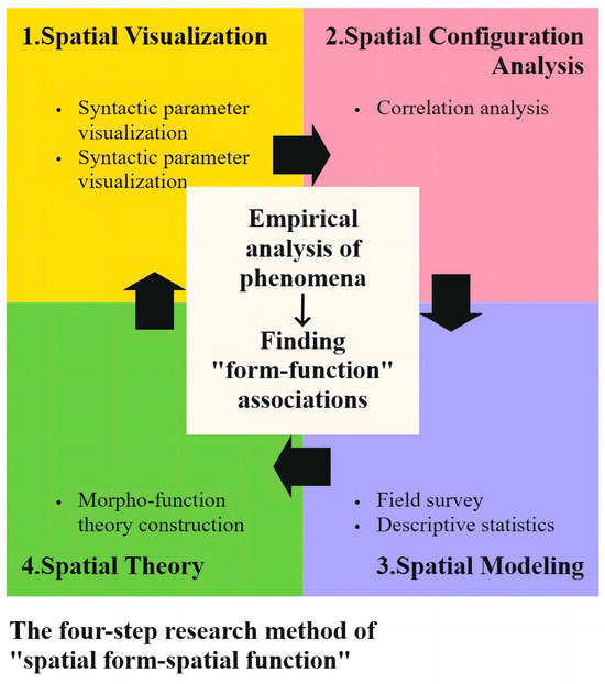 This study aims to examine the spatial distribution characteristics of the catering industry in Macau under different urban morphologies, revealing the impact of street patterns on the spatial layout of commercial activities. To achieve this, this study adopts the four-step framework of “spatial form-spatial function” (hereafter referred to as “form-function”) proposed by [4,35] (Figure 1). Rooted in the principles of Space Syntax, this framework offers a systematic methodology to analyze the relationship between spatial configuration and urban functions, enabling a quantitative understanding of how different urban morphologies influence commercial clustering and accessibility.