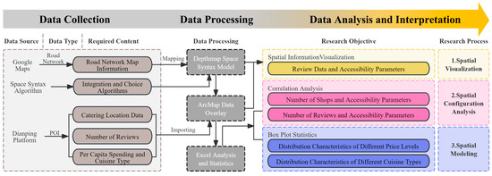 - Data Analysis and Interpretation: Depthmap and ArcMap visualized the spatial information of the segment model’s accessibility parameters, POI data, and combined dataset. Correlation analysis of the overlaid data was conducted in Excel, and boxplots were used for descriptive statistics, supporting the development of spatial models and the validation of spatial theories.