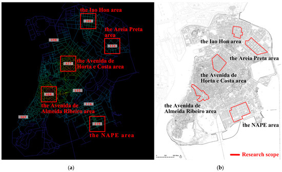After refining the identified centers, five areas with distinct urban morphologies were selected as the study objects (Figure 3b). These include organically shaped areas within historic districts—the Avenida de Almeida Ribeiro area (abbreviated as Avenida de Almeida Ribeiro) and the Avenida Horta e Costa area (abbreviated as Costa)—as well as grid-patterned areas in modern reclamation zones, namely the Iao Hon area (Iao Hon), the Areia Preta area (Areia Preta), and the NAPE area (Zona Nova de Aterros do Porto Exterior) (NAPE). The division of these areas is based on the street network morphology characteristics of the Macau Peninsula [32,33,34].