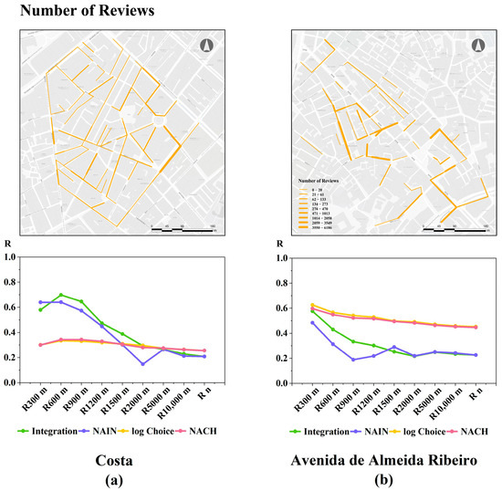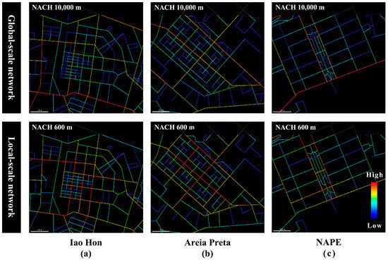 In the Avenida de Horta e Costa area, streets with high urban-scale network accessibility include Avenida do Almirante Lacerda, Avenida de Horta e Costa, and Estrada do Repous (Figure 5a). These significant roads connect various parts of the city and surround and encapsulate the local-scale network within the area. Streets with high local-scale network accessibility include Rua da Barca, the central section of Estrada do Repous, the southern section of Rua de Martinho Montenegro, and the northern section of Avenida de Horta e Costa.