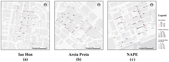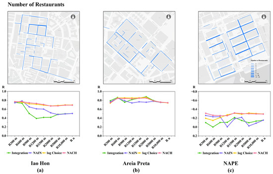The distribution pattern of restaurants in the NAPE area differs significantly from the previous two areas. Streets with high global-scale network accessibility include Avenida Dr. Sun Yat-Sen and Avenida da Amizade, while streets with high local-scale network accessibility are those flanking Parque Dr. Carlos d’Assumpção and Jardim Comendador Ho Yin (Figure 4c). However, restaurants are primarily concentrated along Avenida do Governador Jaime Silvério Marques (Figure 7c), with no apparent correlation to streets of high global or local-scale network accessibility.