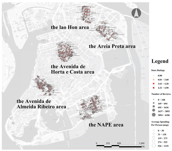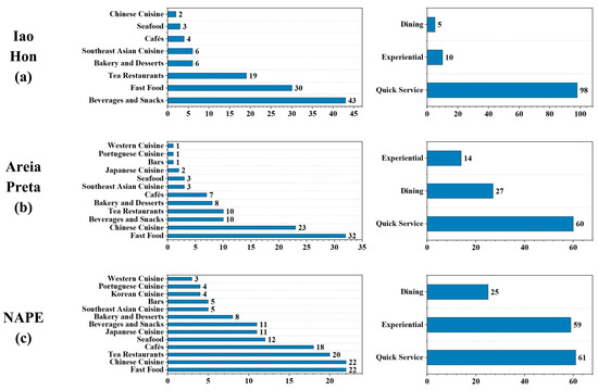 Figure 19 and Figure 20 show that spatial functions have a greater influence over the number of different types of restaurants in grid-patterned areas. For instance, as residential districts, the catering industry in the Iao Hon area and the Areia Preta area align closely with the demands of local residents in terms of consumption levels and cuisine types. Conversely, the catering industry in the NAPE area primarily caters to tourists and office workers, exhibiting a distinct function-oriented characteristic.