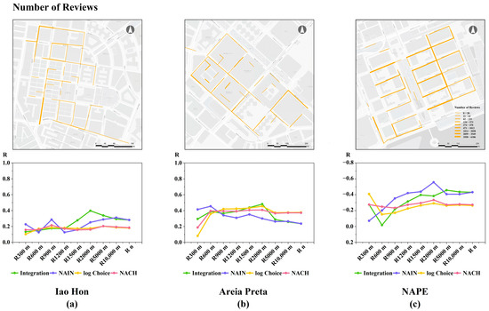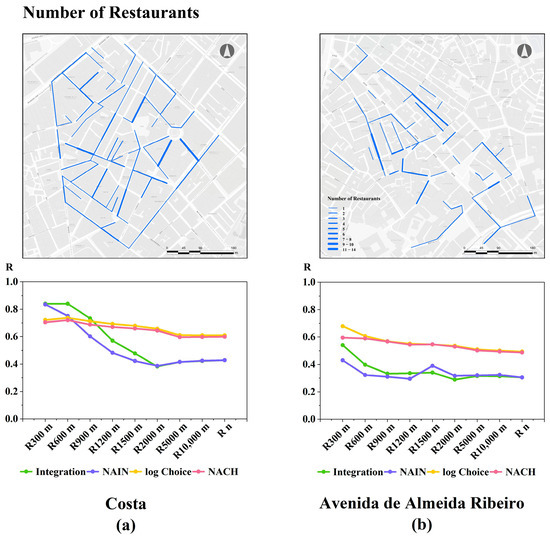 In the Iao Hon area, streets with high global-scale network accessibility include main roads connecting various parts of the city, such as Avenida do Hipódromo. Streets with high local-scale network accessibility are key streets within the area, such as Rua Um do Bairro Iao Hon (Figure 4a). Restaurants are concentrated along Rua da Tribuna, Rua Seis do Bairro Iao Hon, and the southern section of Rua Um do Bairro Iao Hon (Figure 7a). A comparison reveals that the distribution of restaurants highly overlaps with streets of high local-scale network accessibility, though certain deviations are present.