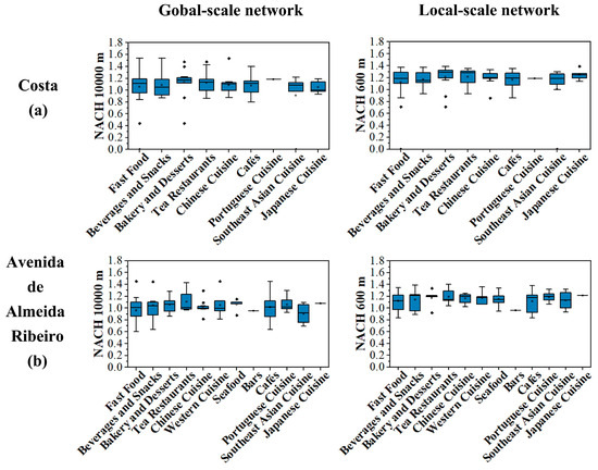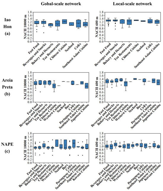 Chinese cuisine, as a group-oriented dining option with personalized and communal features, also has distinct patterns. In grid-patterned areas, the IQR and whisker spans are both wider (e.g., in the Areia Preta area, the IQR values for urban and local scales are 0.24 and 0.27, respectively, and the whisker spans are 0.68 and 0.73, respectively). In organically shaped areas, however, local-scale networks demonstrate significantly higher accessibility (e.g., in the Costa and Avenida de Almeida Ribeiro areas, the median values are 1.2 for both, with IQR of 1.18–1.27 and 1.08–1.22, respectively). This suggests that in grid-patterned areas, Chinese cuisine establishments are more dispersed and less dependent on specific accessible streets. In contrast, in organically shaped areas, they strongly rely on local-scale networks (pedestrian accessibility).