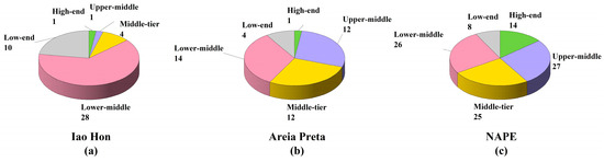 Statistics on the quantity and proportion of different price-range restaurants in organically shaped areas (Iao Hon, Areia Preta, and NAPE).