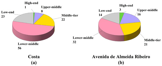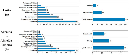 In contrast, as shown in Figure 21 and Figure 22, the quantity of different types of restaurants in organically shaped areas is less affected by spatial functions. Although the Avenida de Almeida Ribeiro area is classified as a tourism district, it demonstrates diversity in both cuisine types and consumption levels, with restaurants evenly distributed. Combined with the findings from the earlier spatial visualization and spatial configuration analyses, this feature can be attributed to the presence of residential streets inhabited by diverse ethnic groups, along with the influence of government-planned tourism streets. Similarly, despite being a residential district, the Avenida de Horta e Costa area exhibits commercial attributes that serve a broader regional scope. Further analysis from the previous spatial visualization and spatial configuration studies reveals that its urban-scale network supports commercial functions extending to other areas. In contrast, its local-scale road network predominantly meets the district’s residents’ needs.