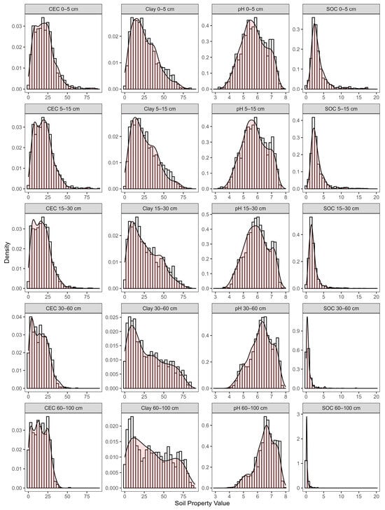 Density plots showing the distribution of cation exchange capacity (CEC, cmol+/kg), clay content (%), pH, and soil organic carbon (SOC, %) at five GlobalSoilMap depth intervals showing the calibration (bars) and validation (pink shaded) datasets after applying the equal area spline for depth harmonization of the soil profiles.