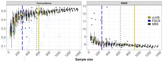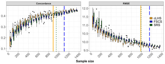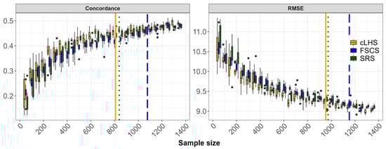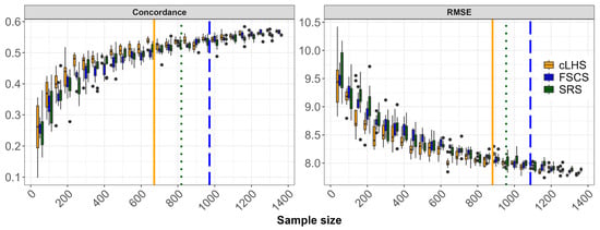 Learning curves based on concordance and root mean square error (RMSE) with increasing sample size from the external validation of the random forest models trained with sample plans developed using the conditioned Latin hypercube sampling (cLHS), feature space coverage sampling (FSCS) and simple random sampling (SRS) for cation exchange capacity at the 0–5 cm depth interval. The solid (orange) vertical line, dashed (blue) vertical line, and dotted (green) vertical line identify the effective sample size for the cLHS, FSCS and SRS algorithms, respectively.