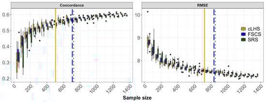 Learning curves based on concordance and root mean square error (RMSE) with increasing sample size from the external validation of the random forest models trained with sample plans developed using the conditioned Latin hypercube sampling (cLHS), feature space coverage sampling (FSCS) and simple random sampling (SRS) for cation exchange capacity at the 30–60 cm depth interval. The solid (orange) vertical line, dashed (blue) vertical line, and dotted (green) vertical line identify the effective sample size for the cLHS, FSCS and SRS algorithms, respectively.