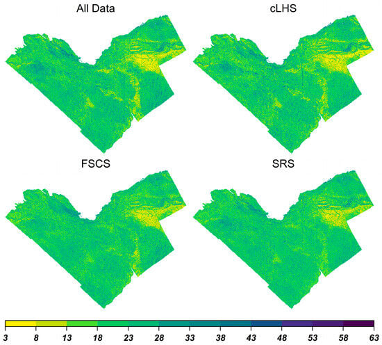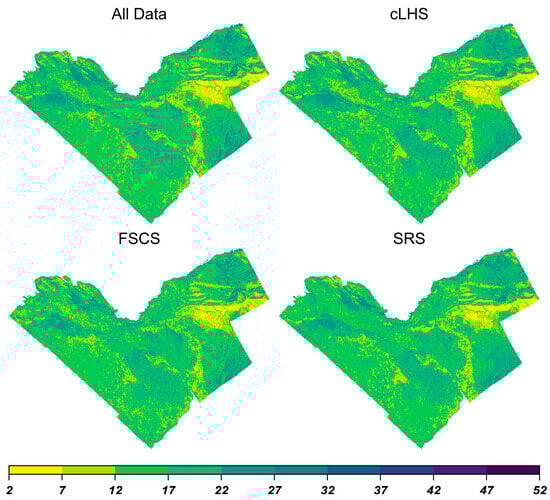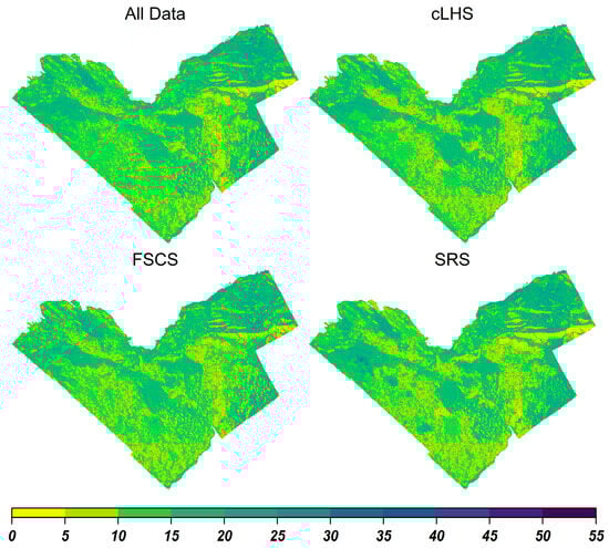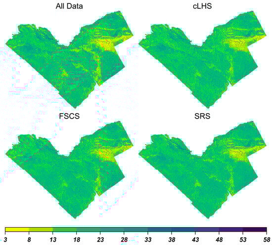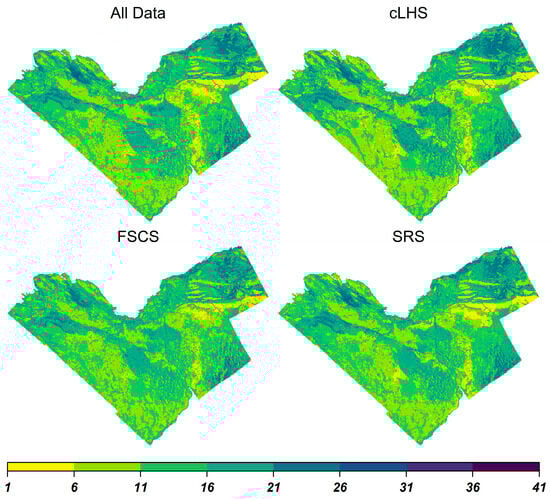 Cation exchange capacity predictions for the 30–60 cm depth interval from the random forest model using all 1391 calibration points (All Data), the conditioned Latin hypercube sampling (cLHS-865), feature space coverage sampling (FSCS-874), and simple random sampling (SRS-869) algorithms.