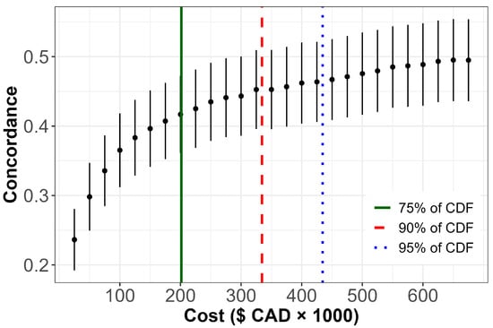 Increase in model performance measured by concordance correlation coefficient (CCC) as a function of the estimated cost of the field program in Canadian dollars across all soil properties and depths. The dotted (blue) line denotes the cost associated with the overall optimal sample size (95% of cumulative distribution of CCC) across all three sampling algorithms (n = 869, or CAD 434,500.00), the dashed (red) line denotes the cost associated with 90% of cumulative distribution of CCC (n = 669, or CAD 334,500.00) and the solid (green) line denotes the cost associated with 75% of cumulative distribution of CCC (n = 403, or CAD 201,500.00). Error bars denote ±1 standard error.
