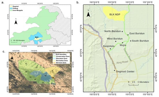 The BLK park (43.109° N–43.161° N, 118.956° E–119.076° E) is in Buridun (village), Wudan (town), Ongniud (county), in Chifeng City of southeastern Inner Mongolia, China (Figure 1a). It is locally named Yulong Shahu and is managed by Inner Mongolia Longgu Tourism Resources Investment Company Limited. The park is 29 km north of the county government center, which is served by the national highway (G306). The park is accessed through the tourism road (Y313) and is connected to the highway (G16) to the far end through the urban ring road (CH) which circles the county center (Figure 1b). All together, these routes support mainstream public access for visiting the park. The declared area of the park is 33.61 km2, with protection zones (Zone C) of 21.31 km2 and other functional zones for education (Zone E), recreation (Zone R), and services (Zone S), in accordance with the NDPs’ establishment regulations (Figure 1c). The total population of central Ongniud (i.e., the local urban center of the county and Wudan town) was 137,238 at the time of the last census, in 2020.